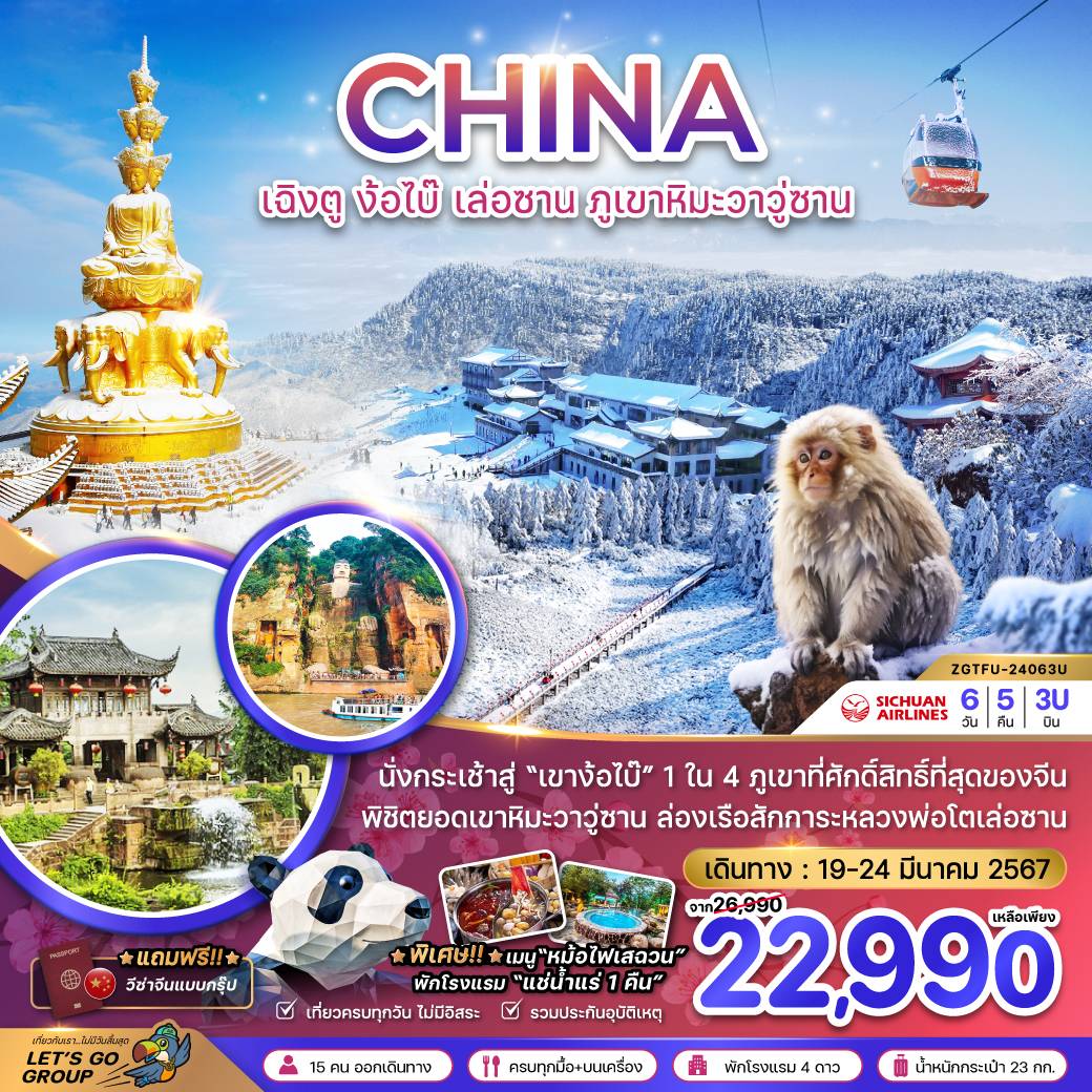 ?? จีนเฉิงตู ง้อไบ้ (ฟรีวีซ่า-พักโรงแรมน้ำแร่) ✅ อาหารครบทุกมื้อ + บนเครื่อง.? ทัวร์ไฟไหม้ จีน เฉิงตู ง้อไบ๊ เล่อซาน ภูเขาหิมะวาวู่ซาน ฟรีวีซ่า 6วัน5คืน?ลด 4,000 เหลือ 22,990? ❗จากปกติ 26,990 บาท❗⭐ รหัสทัวร์ : ZGTFU-24063U✈️ สายการบิน SICHUAN AIRLINES? เดินทาง 19-24 มี.ค. 67 รับได้ 08 ที่