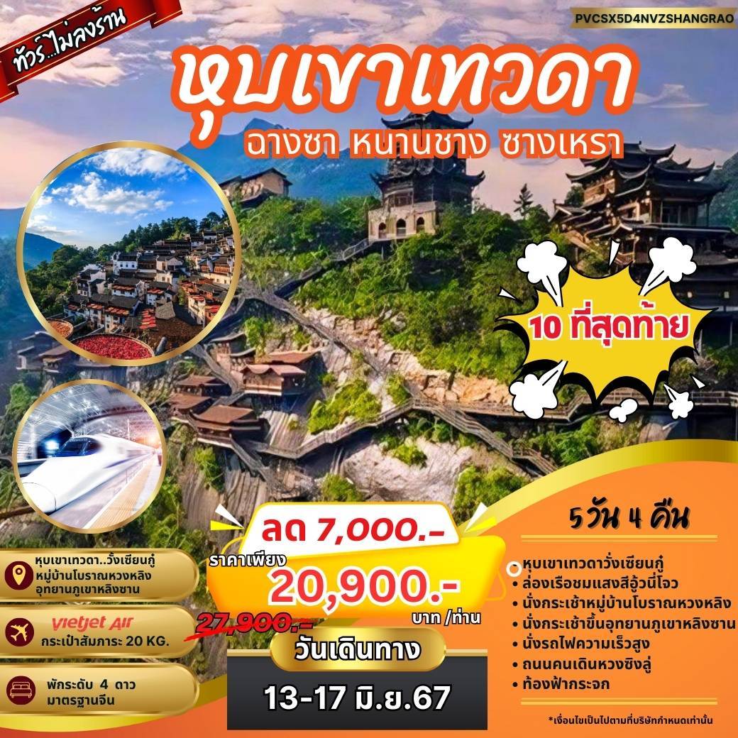 ?? ทัวร์จีนไม่ลงร้าน ? เที่ยวชมหุบเขาเทวดา วั๋งเซียนกู๋ ✅ อาหารครบทุกมื้อ ✅ พัก 4 ดาวทุกคืน.? ทัวร์ไฟไหม้ จีน หุบเขาเทวดา วั๋งเซียนกู๋ หวงหลิง ภูเขาหลิงซาน 5 วัน 4 คืน?ลด 7,000 เหลือ 20,900? ❗จากปกติ 27,900 บาท❗ ⭐ รหัสทัวร์ : PVCSX5D4NVZSHAJGRAO✈️ สายการบิน VIETJET (VZ)? เดินทาง 13 - 17 มิ.ย. 67