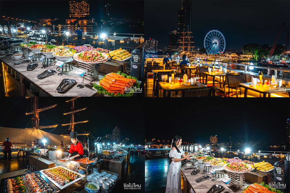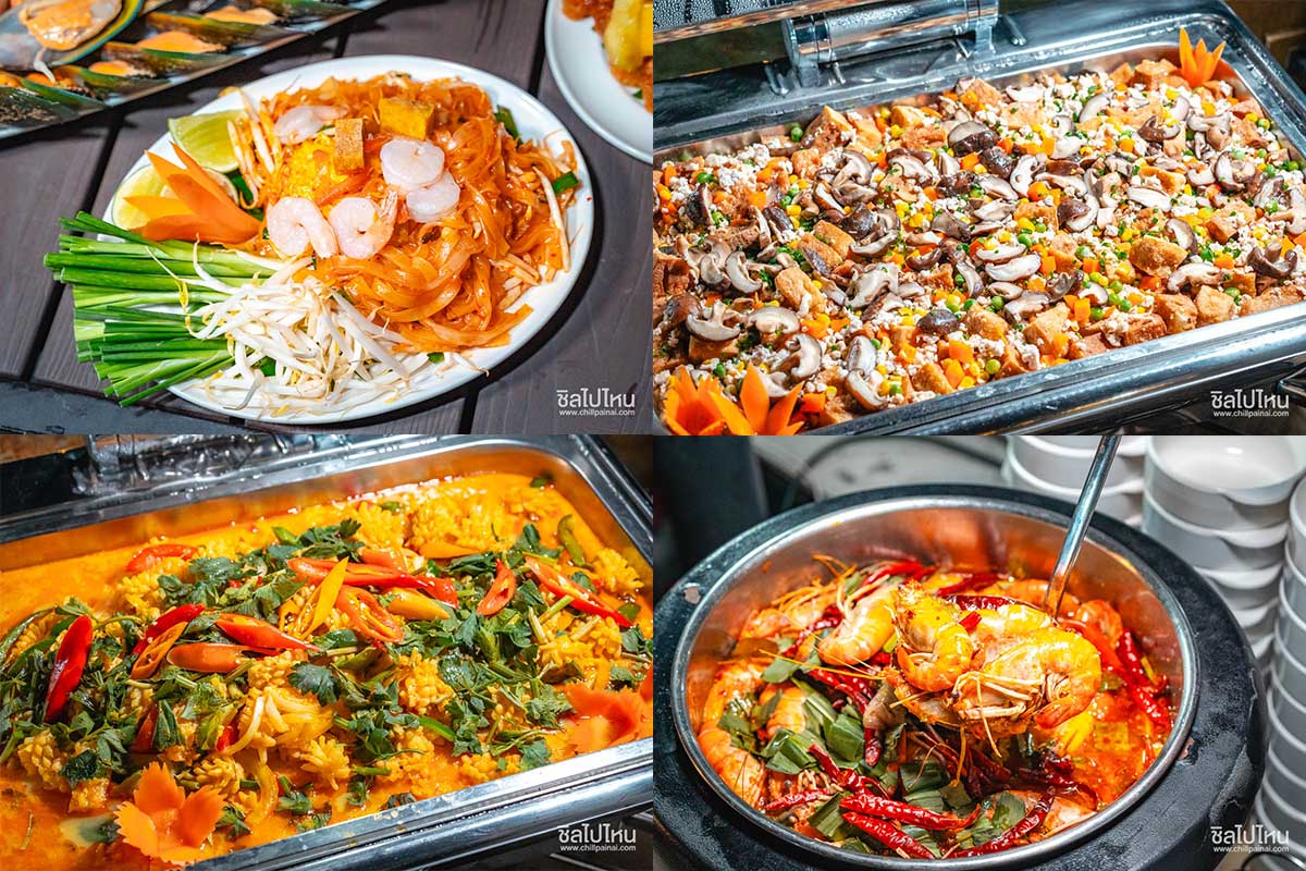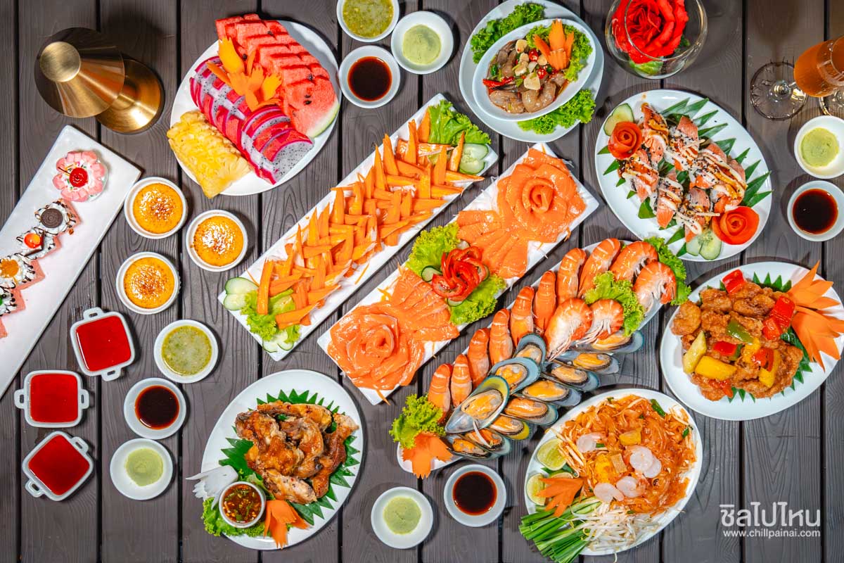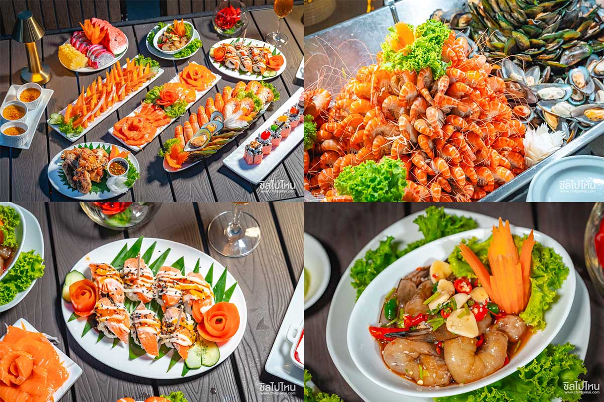 - บุฟเฟ่ต์อาหารนานาชาติและอาหารทะเล + กุ้ง, หอยออนไอซ์ + แซลม่อน