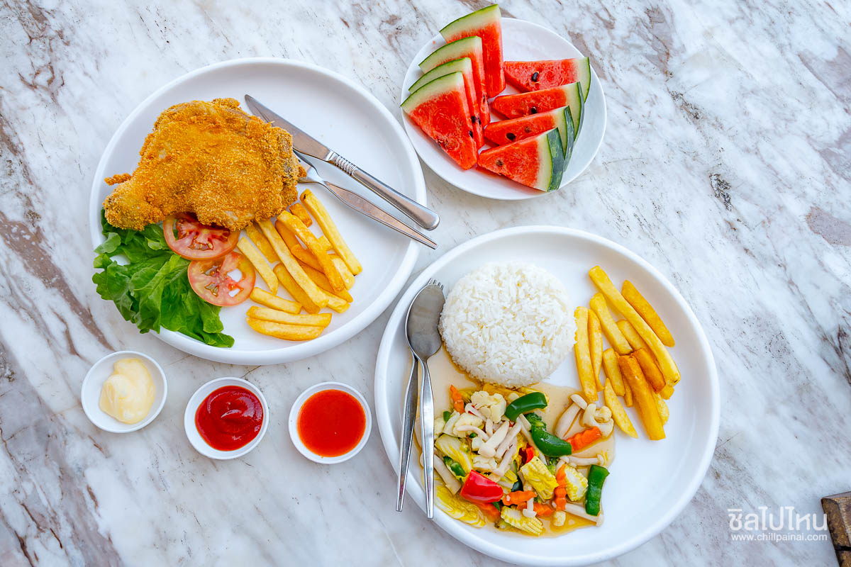 - อาหารกลางวัน (สเต๊กหมูหรือไก่)