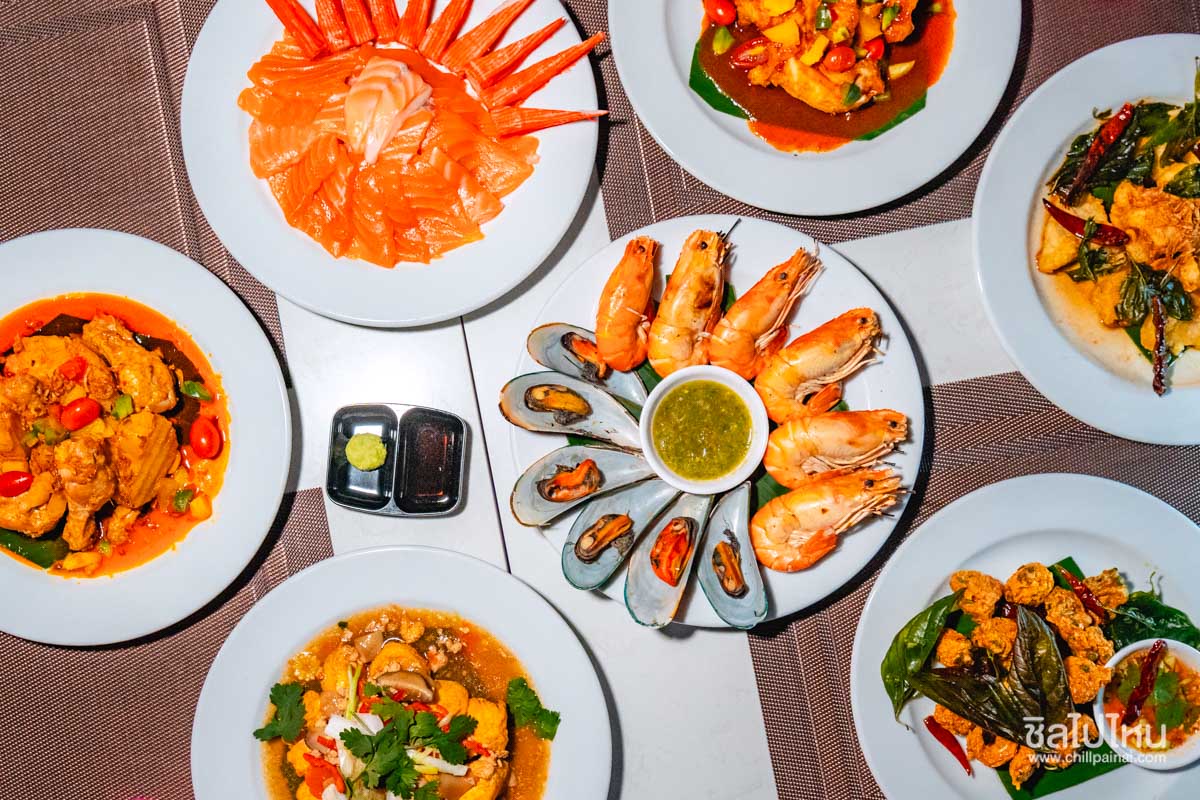 - บุฟเฟ่ต์อาหารนานาชาติ กุ้งเผา หอยเผา แซลมอนซาซิมิ ซูชิ