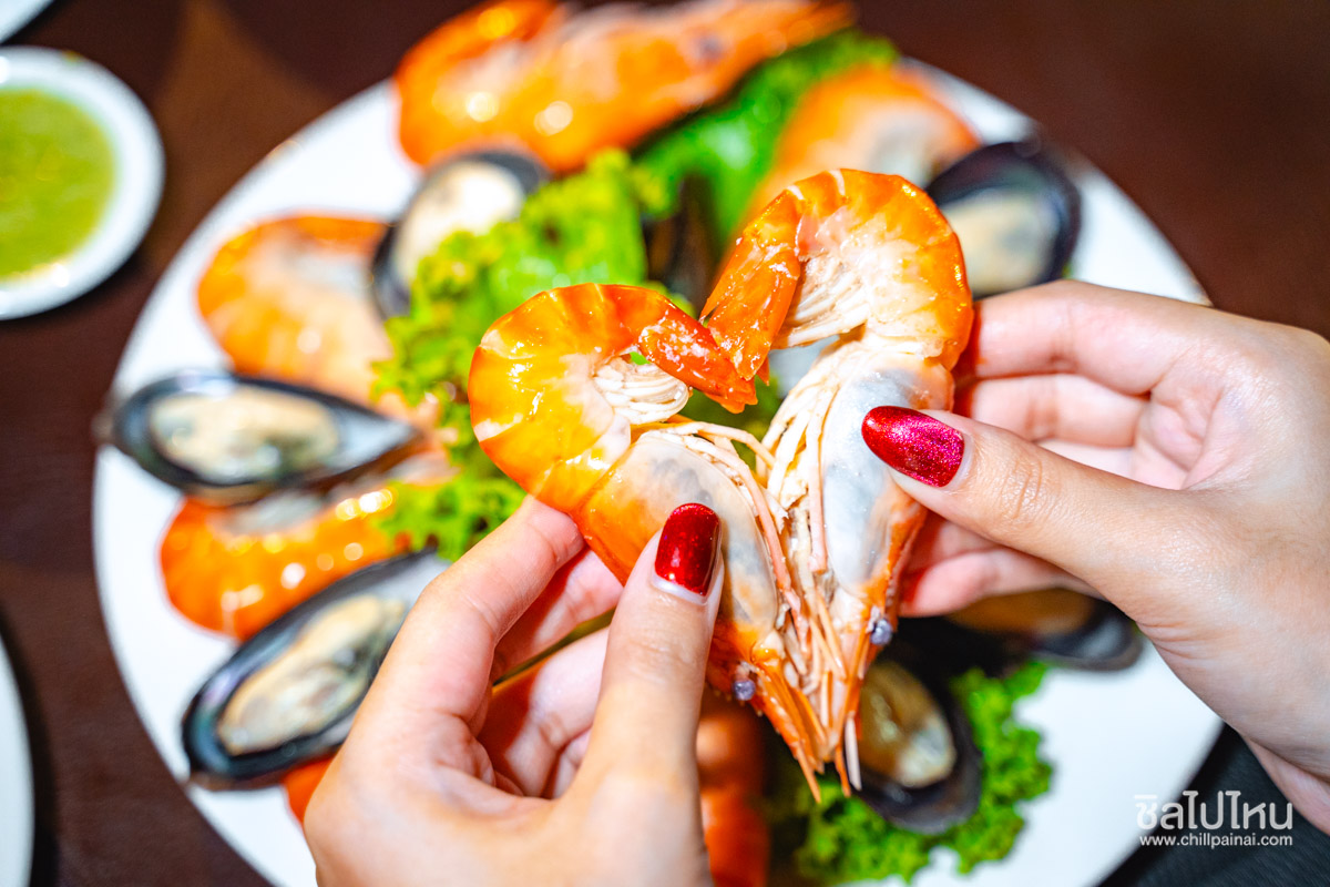- บุฟเฟ่ต์อาหารนานาชาติและอาหารทะเล กุ้ง, หอยออนไอซ์ + แซลม่อน