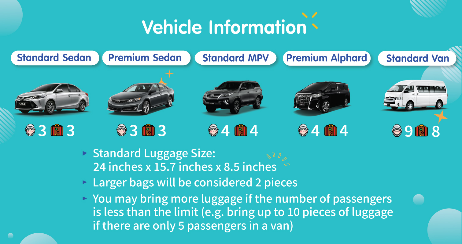 - กรณีเที่ยวบินล่าช้า กรุณาส่งอีเมลหรือข้อความเพื่อตรวจสอบความพร้อมของคนขับ (มีค่าบริการล่วงเวลาเพิ่มเติม)