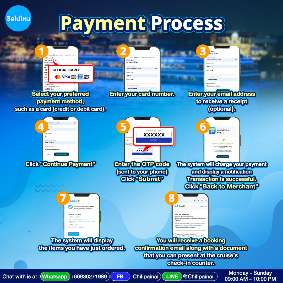 - โซนที่นั่งบนเรือเจ้าพระยาอาจมีการจองเต็มในบางช่วงเวลา หากโซนที่คุณเลือกเต็ม เราจะติดต่อกลับผ่านช่องทางที่ให้ไว้เพื่อแจ้งปรับเปลี่ยนโซนที่นั่งค่ะ